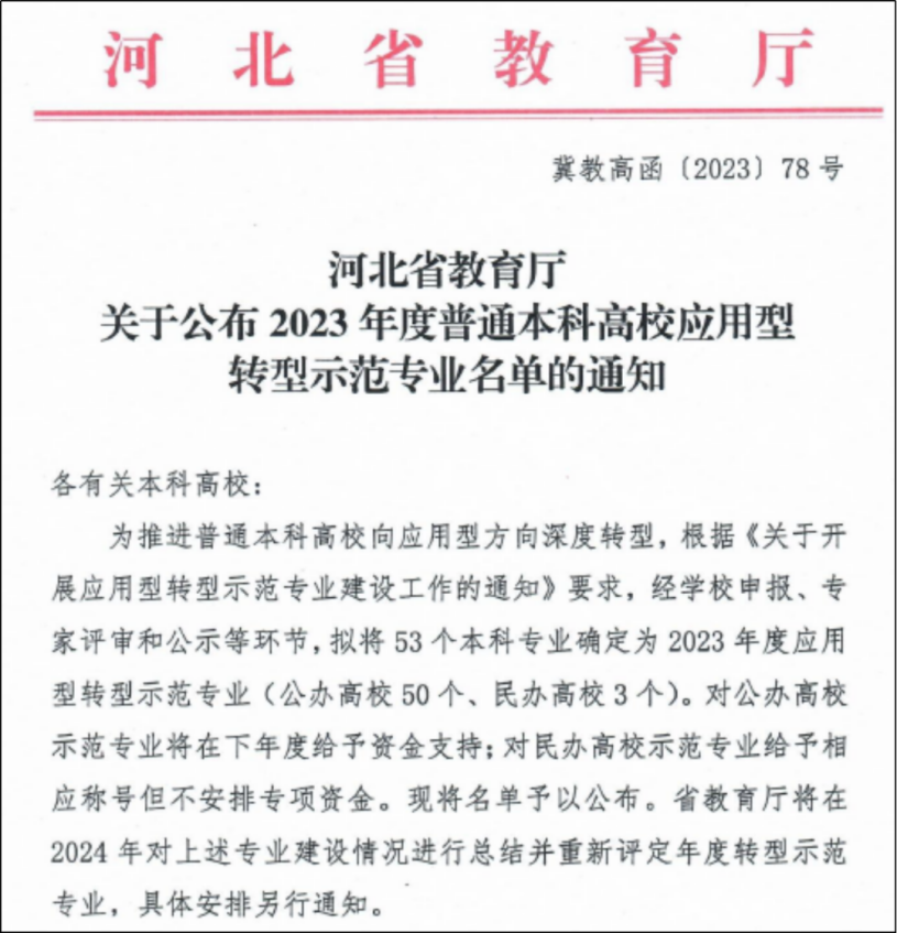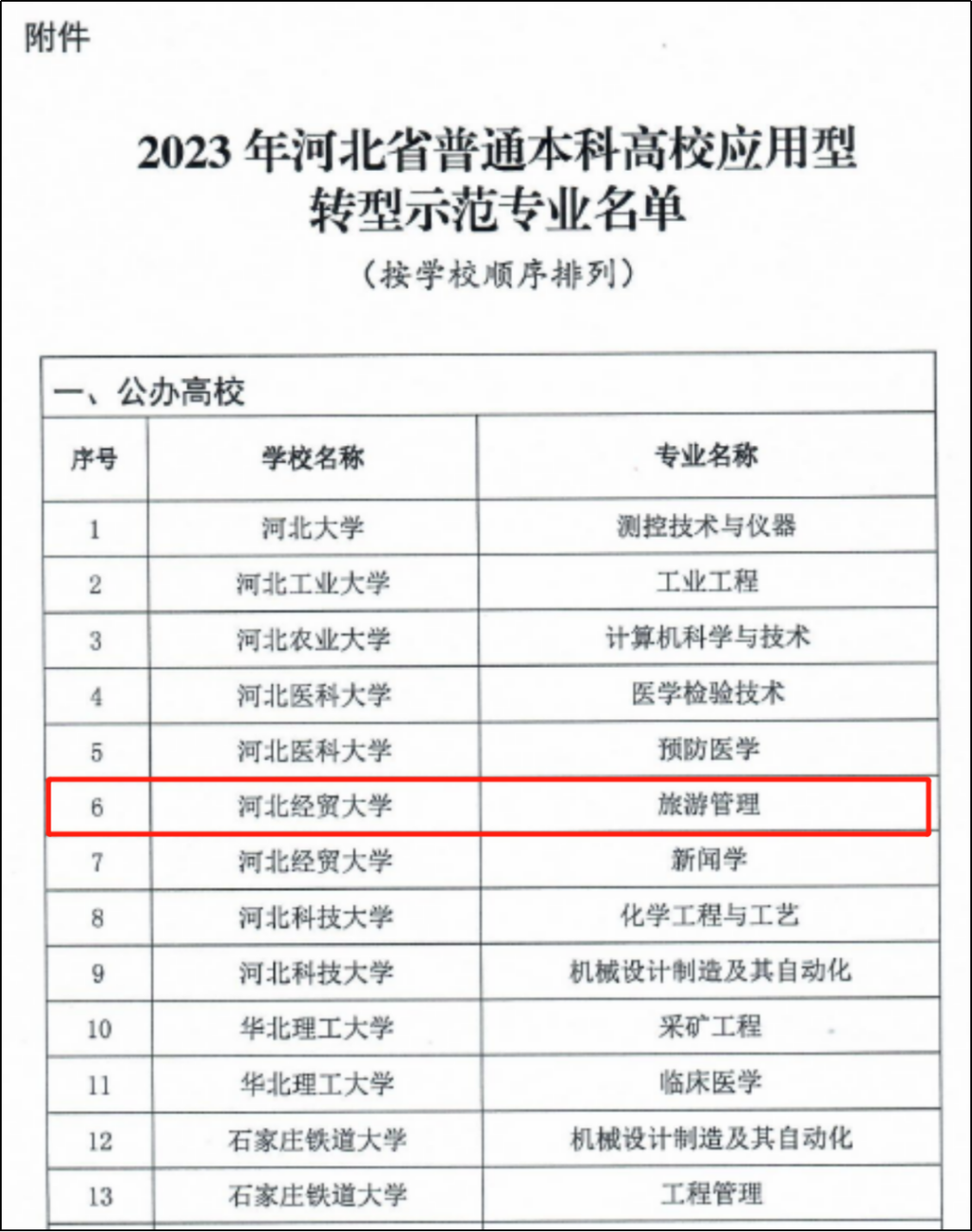 近日,河北省教育厅发布了《河北省教育厅关于公布2023年度普通本科高校应用型转型示范专业名单的通知》,经公司申报、专家评审和公示等环节,拟将53个本科专业确定为2023年度应用型转型示范专业,其中公司旅游管理专业成功入选,标志着旅游管理专业在产教融合、校企合作、服务区域经济发展等方面成绩斐然。