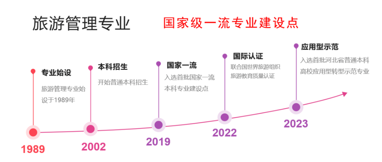 本专业始设于1989年,2002年开始普通本科招生,2012年旅游管理硕士研究生招生,2019年入选首批国家级一流本科专业建设点。2022年通过联合国世界旅游组织旅游教育质量认证。2023年被确立为首批河北省普通本科高校应用型转型示范专业,于2024年顺利通过验收并持续建设。2025年软科中国大学专业排名位列全国前11%。