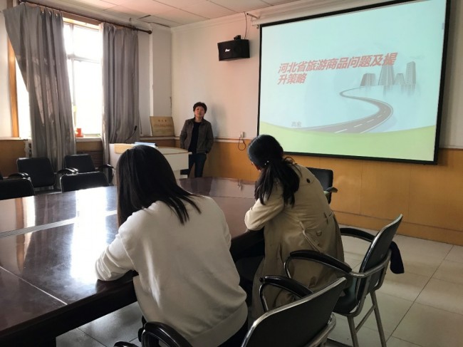 2018年10月19日下午14:30,bg大游集团官方网站旅游企业服务创新团队的小组会议在公司二楼205举行,高宏经理分享了“河北省旅游商品问题及提升策略”,团队教师王彦洁、赵学娇参加了此次活动。高经理就旅游商品的涵义、开发意义、河北省旅游商品发展目前普遍存在的问题和原因进行了分析,并有针对性的提出河北省旅游商品发展策略。结合旅游商品开发和旅游发展的当前形式,团队成员讨论了“创意”在培养员工和旅游商品开发中的重要性,并指出在教学和科研过程中要开阔思路,创新思维。
