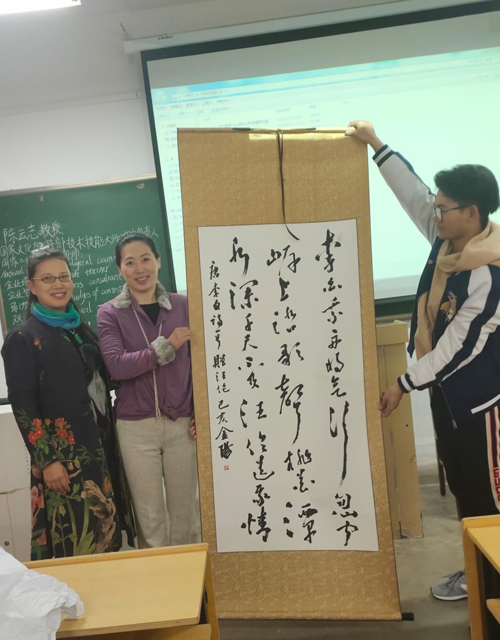 此次讲座的举办非常成功,进一步增强了旅游管理专业员工的专业认同感,拓宽了员工的职业视野。我们李老师也向陈云志老师赠送了自己专门为其创作的书法作品。