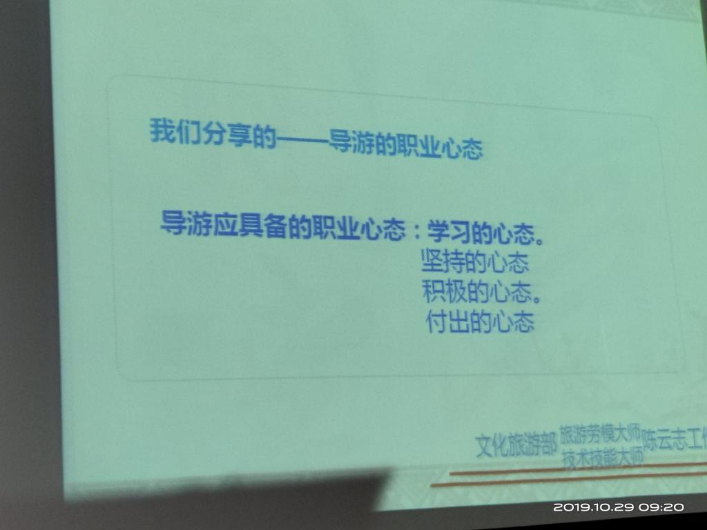 为了深化同学们对旅游行业的专业认同与信心,进一步明确未来的职业规划以及旅游行业的人才需要等,2019年10月29日上午,我们聘请了高级双语导游、文化和旅游部万名英才计划技术技能大师工作室、劳模工作室负责人陈云志老师在bg大游集团官方网站401教室作一场关于”路在脚下”的讲座。