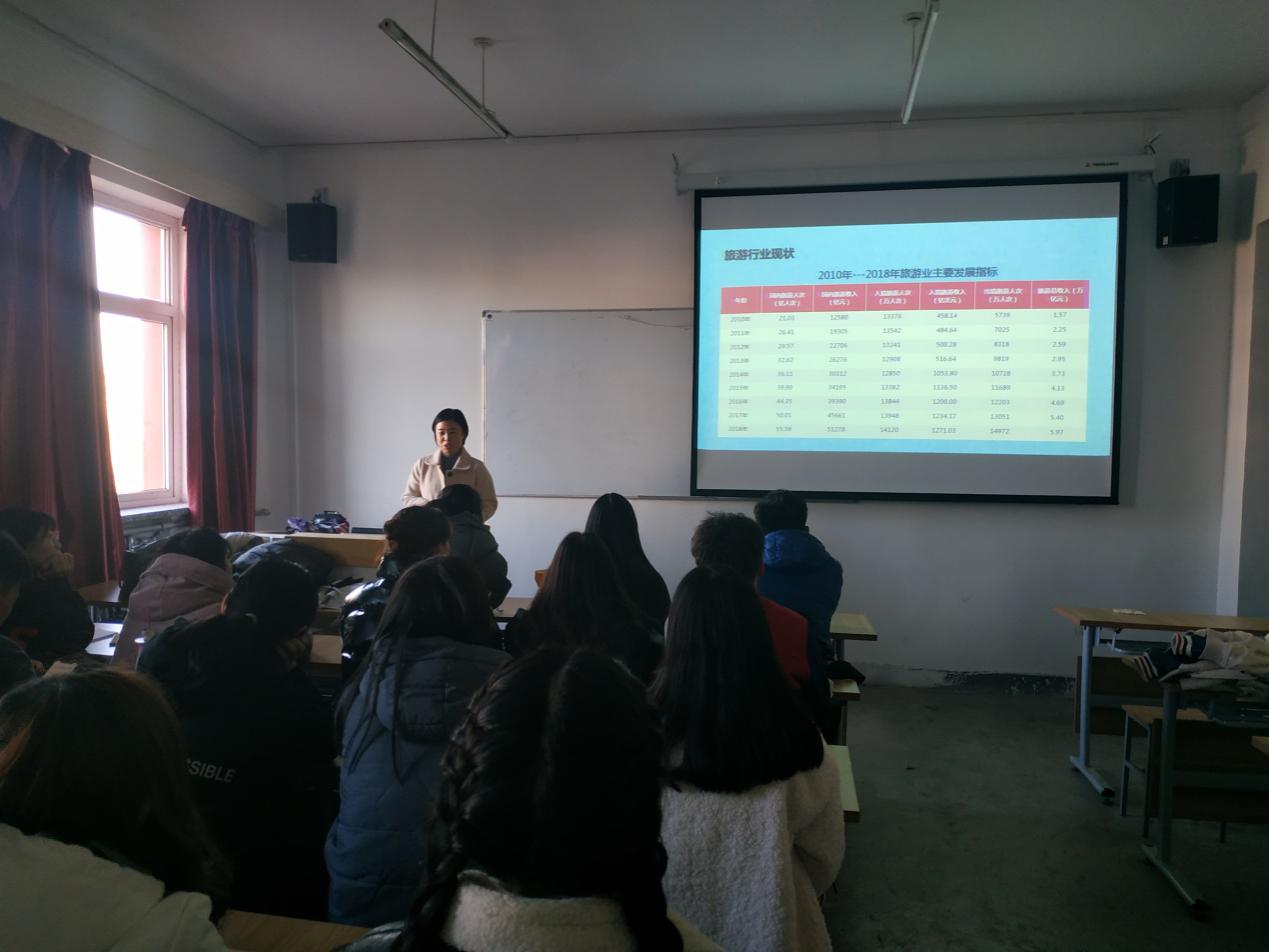 为了提高员工们对旅游专业的了解与积极性,让同学们投身于旅游行业中,2019年12月3日,旅游学概论的课堂上,河北东方国旅的优秀领队郭杰女士为同学们上了一堂主题为深入客观了解旅游业现状以及职业发展的生动的课。课堂话题环环相扣,专业性很强,获得了同学们的阵阵掌声,这堂课不仅让同学们对心中憧憬的旅游业有了新的定位,也解决了同学们心中对旅游业的困惑。相信通过这堂课,同学们不仅更加热爱旅游业,也会更加勤奋努力的学习与钻研!