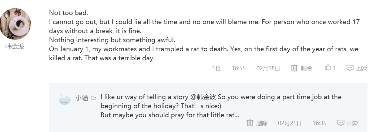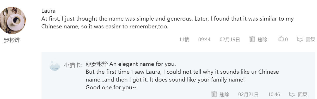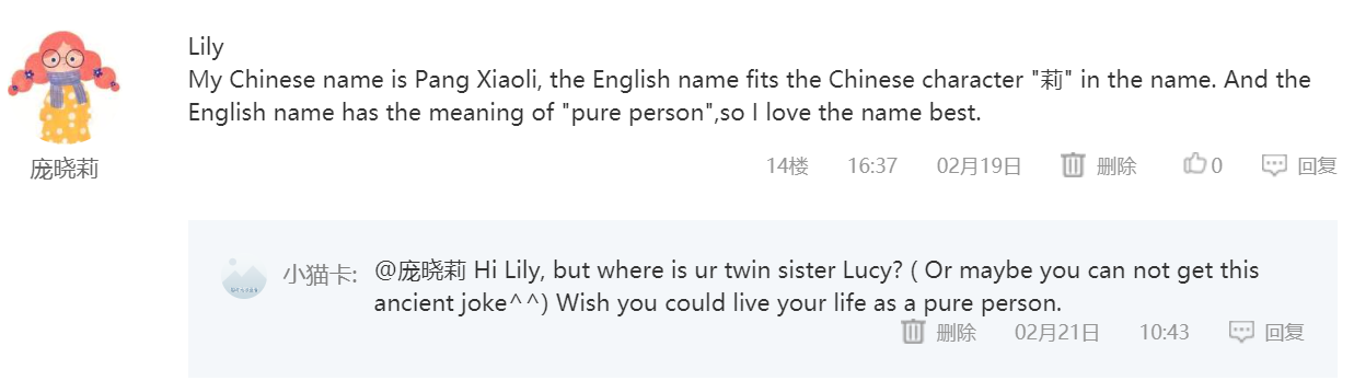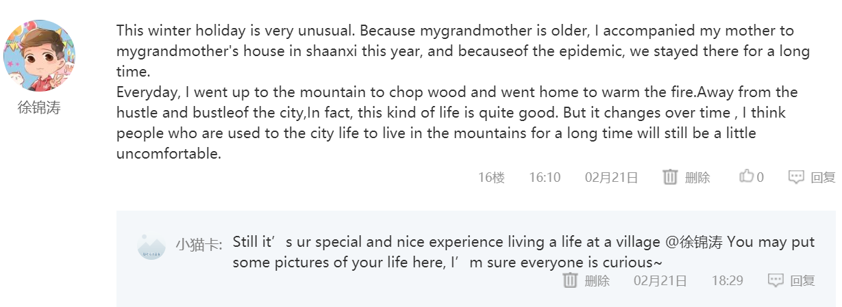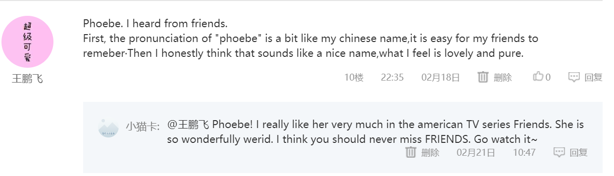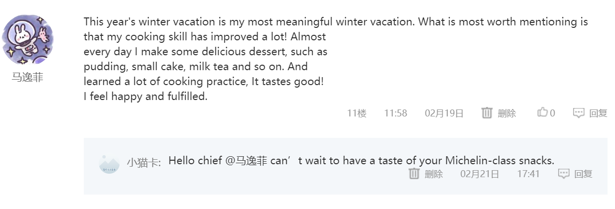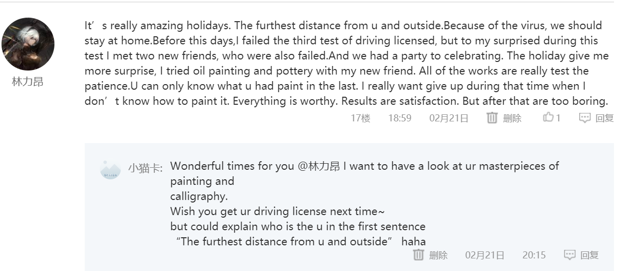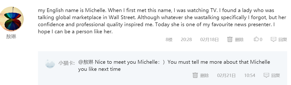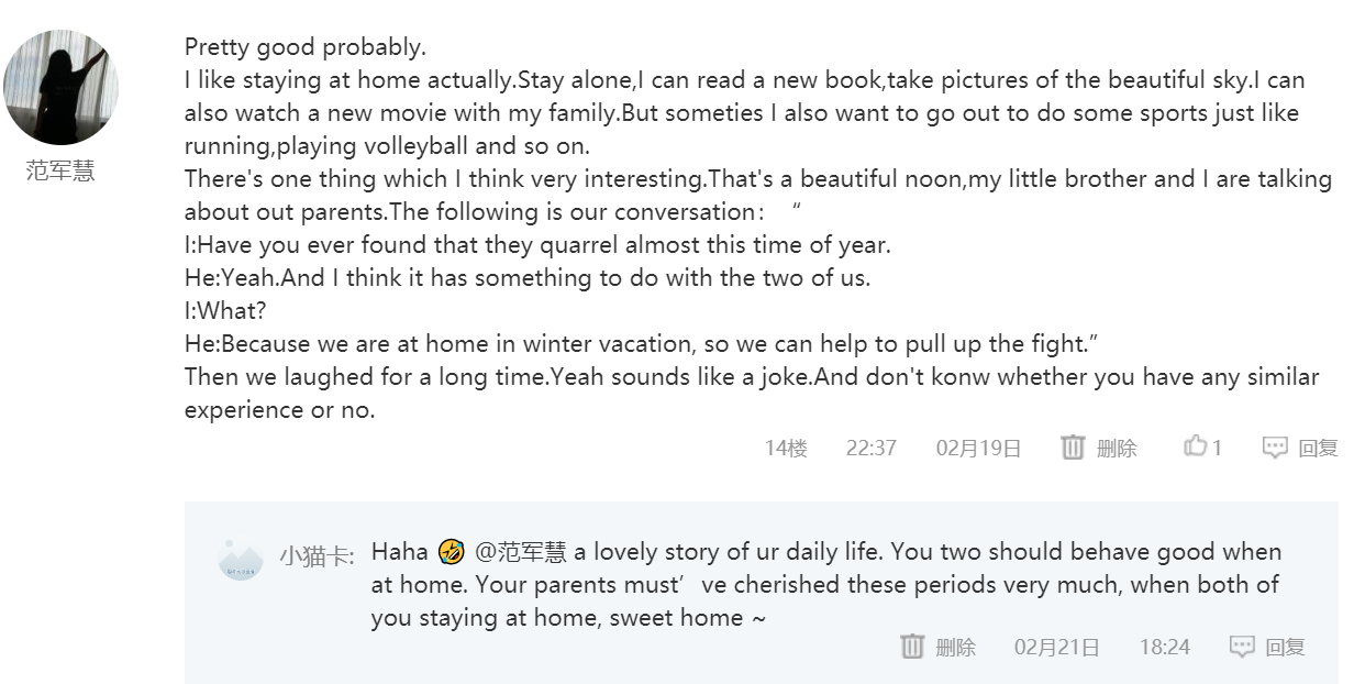 为了确保所有同学都可以按计划进行学习,安排互动环节。互动分为两部分,一为话题讨论,一为在线答疑。话题讨论根据每周学习主题安排,要求全英回答,对每位同学的答案进行回复于点评,同学相互之间可以留言讨论;开辟答疑话题,有问题的同学可以随时匿名留言。课程的错峰进行,可以实现同学时间安排上的灵活性,一定程度上提高了学习效率。