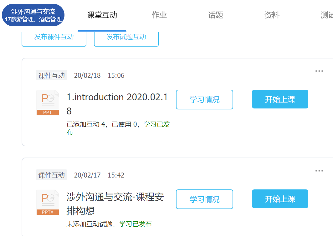 本课程是面向公司大三员工开设的专业选修课,根据课程关键字,将课程内容锁定为涉外礼仪与翻译、沟通心理学、跨文化交流技巧三大板块,提高员工涉外英语口语为重点学习目标。在返校之前的这段特殊时期,基于课堂派平台,以知识学习与员工自主练习为主;待到开学时,再强化口语练习。