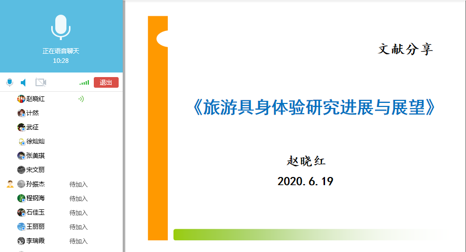2020年6月19日下午,旅游融合方向科研沙龙在QQ群以语音+屏幕分享方式进行,主讲人赵晓红老师为大家分享了文献《旅游具身体验研究进展与展望》。“旅游具身体验” 受具身理论启发,关注旅游与身体的关系,为旅游者经由自我身体与旅游世界发生交互并获得存在意义的过程。赵晓红老师详细介绍了文献要点:旅游具身体验研究发展三阶段;旅游具身体验研究成果两维度、六领域;旅游具身体验研究评价,并阐述了个人认识。随后,科研小组的各位老师就“旅游具身体验”的研究方向和研究内容进行了讨论,纷纷发表见解。