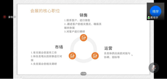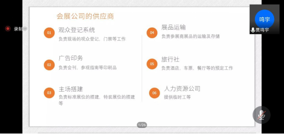 2020年11月29日上午,在《会展经济》课堂上,公司19届会展经济与管理专业毕业生贾鸣宇通过线上腾讯会议的形式与18级会展经济与管理专业的员工进行了关于商业会展运营的交流分享。