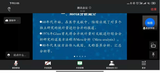 李瑞霞老师首先对Meta分析(Meta Analysis)方式进行了简单的介绍。Meta分析是当今比较流行的综合具有同一主题的多个独立研究的统计学方法,是较高一级逻辑形式上的定量文献综述方法。随后,李瑞霞老师针对 Meta分析软件—— MetaWin,进行了实际操作与讲解。在场的教师与员工也通过提前安装软件、获得练习材料,进行了同步操作,获得了较为良好的学习效果。讲座结束后,李瑞霞老师与线上线下师生就研究设计、软件选择等多方面问题进行了讨论,气氛热烈。