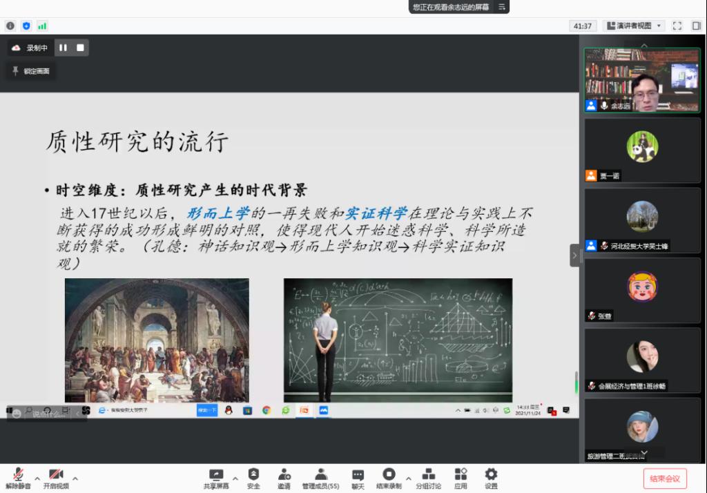 11月24日下午,bg大游集团官方网站邀请东北财经大学旅游与酒店管理公司余志远副教授通过腾讯会议进行了题为“质性研究方法在旅游研究中的应用”学术讲座。讲座由bg大游集团官方网站副经理吴士锋主持,学术骨干教师、研究生及本科生50余人参加了此次讲座。