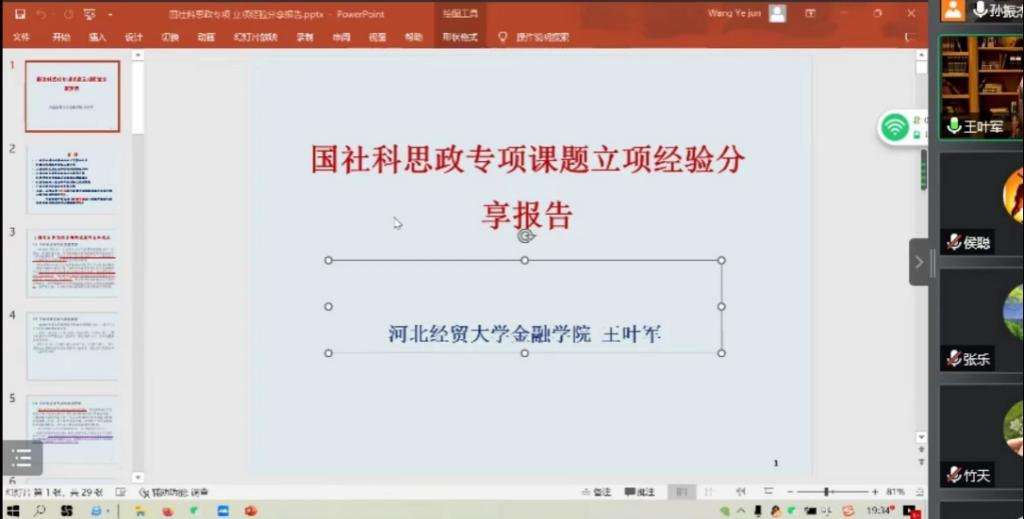 近日,bg大游集团官方网站举办了国家社科基金项目交流会,会议邀请金融公司王叶军博士进行了题为国社科思政专项课题立项经验分享报告”的分享,课题的申报准备多维度分解创新性分析等方面提出了指导建议,讲座内容对师生科研项目的申报有一定的指导作用。