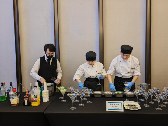 在论坛间歇设有一项特别的环节,是希尔顿集团精心准备的实习生才艺展示,包括中式摆台、特色调酒、冷菜厨艺等。公司员工赵莎懿现场展示了多款鸡尾酒的特色调制才艺,娴熟帅气的调酒技能赢得了现场观众的一致好评。