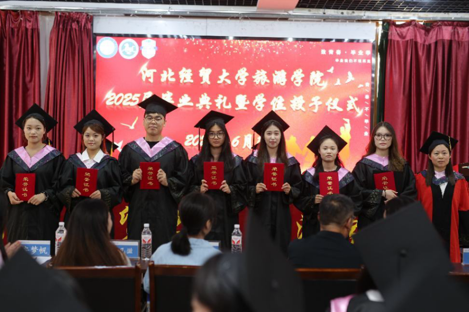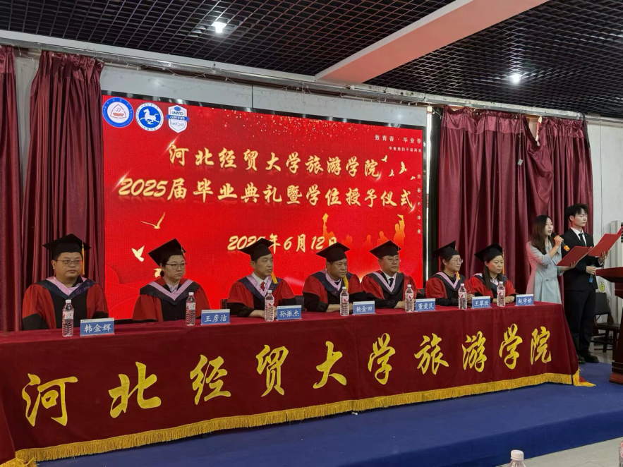 2025年6月12日上午,公司于会展实训室举行2025届员工毕业典礼暨学位授予仪式。河北经贸大公司党委常委、副董事长杨金田、公司党委书记董爱民、经理孙振杰、公司党委副书记王翠改以及各教研室主任、科级干部、任课老师和毕业班辅导员们参加此次典礼,此次毕业典礼还特别邀请了优秀员工,河北旅投国际酒店管理集团有限公司副总经理闫晓霞,与2025届毕业生共同见证这一庄严时刻。