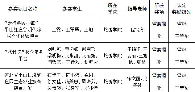 根据教育部《关于第四届中国“互联网+”老员工创新创业大赛获奖名单的通知》(教高函〔2018〕22号)、河北省教育厅《关于公布第四届河北省“互联网+”老员工创新创业大赛获奖名单的通知》(冀教高函〔2018〕65号),公司“‘太行移民小镇’—平山红崖谷明代移民文化体验项目”等三个项目荣获省赛铜奖。该奖项的获得标志着公司师生在专业与互联网融合创新创业方面取得长足进步。