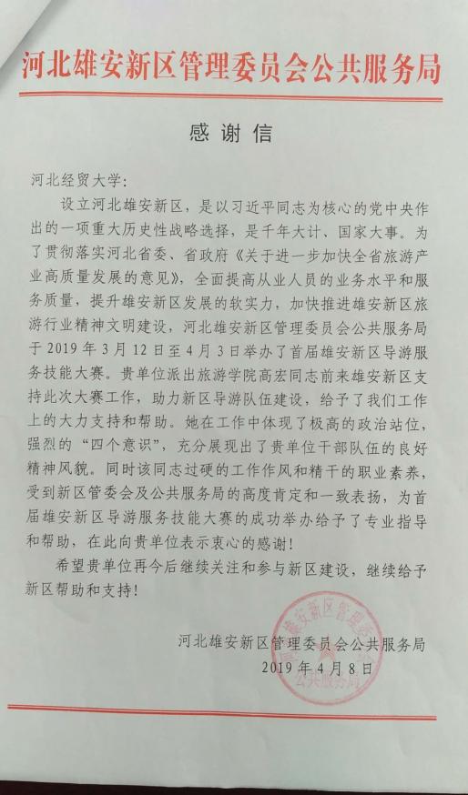 2019年3月12日至4月3日,雄安新区举办了首届雄安新区导游服务技能大赛,公司高宏教授到场支持大赛工作,助力新区导游队伍建设,受到新区管委会及公共服务局的高度肯定和一致表扬,为首届雄安新区导游技能大赛的成功举办提供了专业指导和帮助。