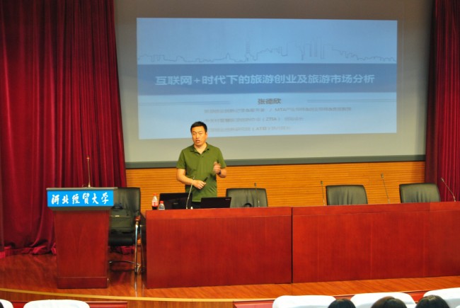 张得欣经理阐述了讲述了互联网+和互联网+时代的六大特征,论证了"互联网+时代"模式中的旅游大势。另外张经理还从团队人员的组建和创业中的重要因素等方面对中国旅游的创新创业进行了分析,讲座的及时性、实用性和前沿性收到同学们强烈好评。