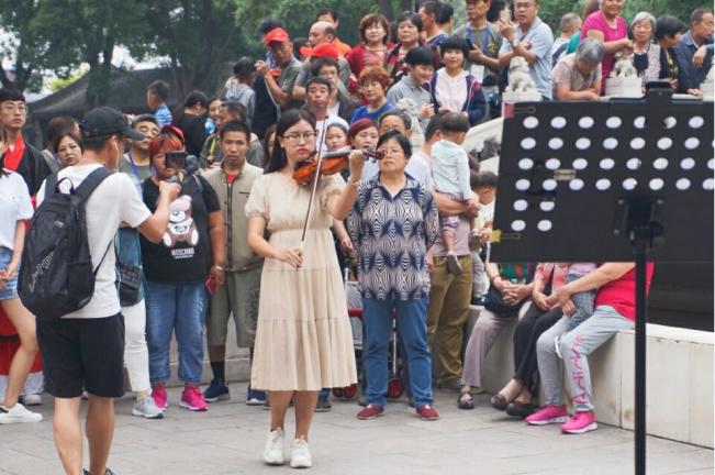 上午9点20分,主题快闪活动正式拉开帷幕。17级旅游管理专业员工才艺秀表演率先登场,他们各展其能,既有优美欢快的小提琴演奏,又有清新唯美口琴展示,更有热辣舞蹈的展示,赢得现场市民游客阵阵掌声。接下来的重头戏是诗赋朗诵,同学们身着汉服,大声吟诵由旅管教研室教师张国鑫创作的《新时代经贸旅游赋》,慷慨激昂的朗诵将快闪活动推向了高潮。