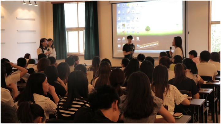 其中给大家印象最深的一个小组是做零食销售的,他们还在讲解的过程中给同学们分发了零食,调节了课堂氛围。最后由王慧东老师进行总体评价和课堂总结。在整个环节中,同学们积极参与,掌声互动,师生们在愉快的氛围中完成了此次交流会。