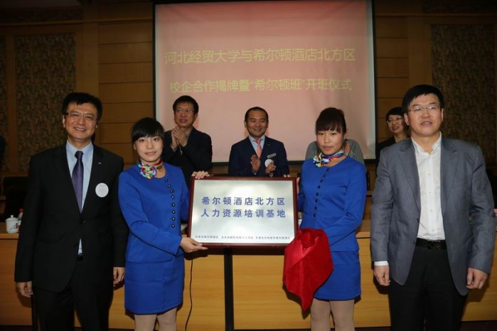 纪良纲和石家庄希尔顿酒店总经理刘浩然为“bg大游集团官方网站酒店管理实践教育基地”、“希尔顿酒店北方区人力资源培训基地”揭牌。公司还与中国希尔顿酒店北方区建立合作关系,签订校企合作协议,并在酒店管理专业开设“希尔顿班”。
