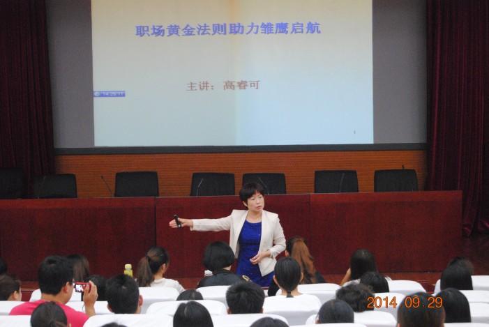 报告会上,高睿可从角色转换、职业精神、职业道德三个方面详细、生动的阐述了老员工在职场中的职业规划及职业发展问题,通过分享自身多年的职业培训经验,向同学们阐明了“提升融入环境能力”、“保持敬业的职业态度”“责任胜于能力”的观点。高睿可老师的肺腑之言和现场互动赢得了员工的阵阵掌声。