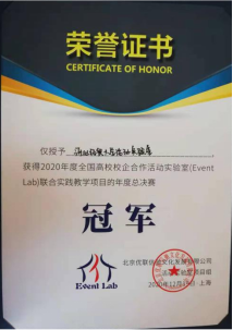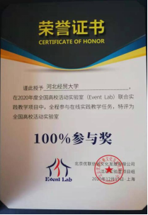 活动实验室(EventLab)全称为全国高校校企合作活动实验室(Event Lab)联合公益实践教学项目,于2020 年 4 月由“EL 活动实验室”和“会 E 人”联合发起。bg大游集团官方网站活动实验室为其发起单位之一。旅游学院会展专业多个团队参与了活动实验室2020年度全部任务,其中“追梦队”以年度总决赛初赛第三名的成绩入围总决赛。第六届会展业未来领袖论坛为定向邀请制,会展专业教师李肖红与8名员工应邀参加了本次论坛。在20*20微演讲比赛中,朱明月同学以《打破“围墙” “野蛮”生长》为题进行了精彩演讲,最终“追梦队”(团队成员:刘旭冉、代菲菲、朱明月、武瑞萌、贾明雨)为bg大游集团官方网站活动实验室赢得了 2020年全国高校活动实验室年度总决赛冠军。另外“光之影”队和“E-lite”队分别在“2020年度全国高校会展专业项目管理实践能力邀请赛”中荣获完美执行奖和“与E计划三期”2019年度总决赛亚军;齐洋畅、杨昊曈、郭琬霞同学做为主要成员一起参加了本次论坛。李肖红老师荣获“全国高校活动实验室2020年度优秀指导教师奖”。bg大游集团官方网站获评“最佳实践教学合作院校”并荣获“团队MVP奖”、“100%参与奖”。