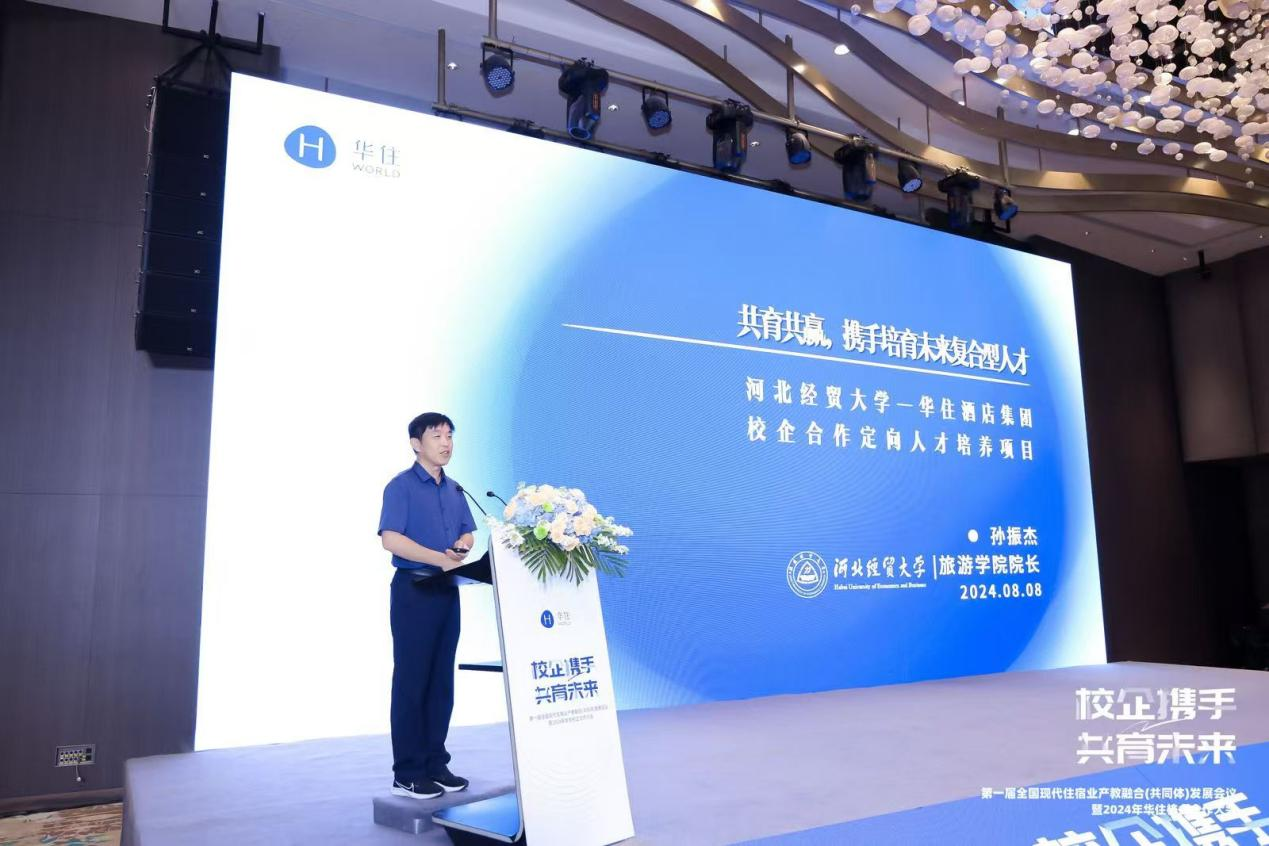 88日,全国现代住宿业产教融合共同体发展会议暨2024华住集团校企合作大会在上海隆重举行,公司经理孙振杰、酒店管理系主任韩金辉、副主任计然、办公室主任张军毅参会,经理孙振杰受邀在大会上作校企合作优秀实践案例报告。