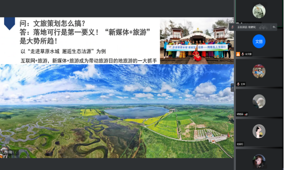 张建军首先向同学们分享了一年多以来自己从实习到就业、从员工视角到职场视角的转变;其次分析了文旅行业的发展动态与趋势,并结合自己工作期间参与的项目,就疫情常态化时期文旅人自身该如何提升、掌握哪些基本技能,以及在这一背景下完成一项策划应当注意的事项等进行了深度讲解。