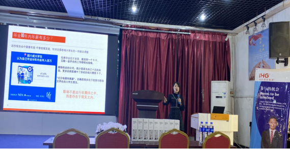 紧接着,成溪总监为同学们做了详尽的职业生涯规划设计的专题分享,并结合自身从基层到总监的个人职业发展经历,为同学们分析国际高端酒店业就业的素质要求、发展优势、职业前景和生涯规划,鼓励同学们在校期间要做好专业知识、实践能力、综合素养的储备,为未来的职业生涯奠定良好的基础和平台。