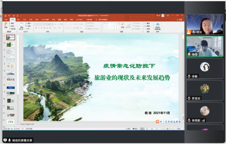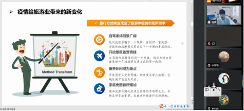 11月14日上午9时,《旅游规划原理》课堂邀请吉林省吉财集团总工程师、吉林省文旅厅杨佳以“疫情常态化防控下旅游业的现状及未来发展趋势”为主题的专题分享。本次会议在腾讯会议平台进行,由bg大游集团官方网站庞笑笑老师主持,19级旅游管理专业60余名本科生参加了此次分享会。