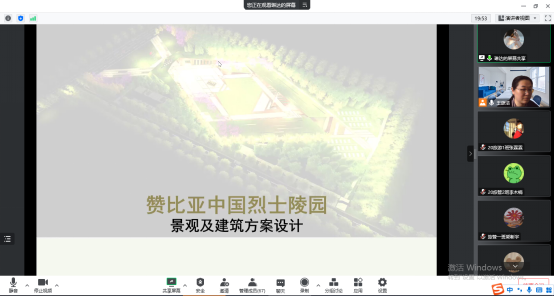 2022年10月14日下午14:00,《旅游景观审美与设计》课程邀请北京汉通建筑规划设计有限公司河北分公司项目经理张丽娜经理讲座,形式为线上(腾讯会议)。张经理系统的介绍了《赞比亚中国烈士陵园景观及建筑方案设计》,结合项目设计和项目落地过程的实战经验,张经理从特征要素提炼到景观功能分区、景观设计思路、呈现效果以及最终成果等均做了详细阐述,从专业角度为同学们呈现了项目设计及实施过程。
