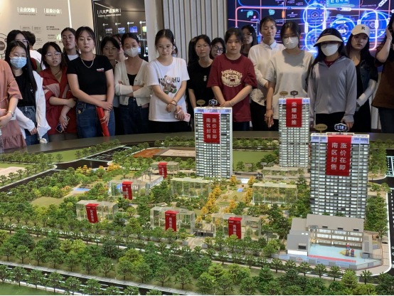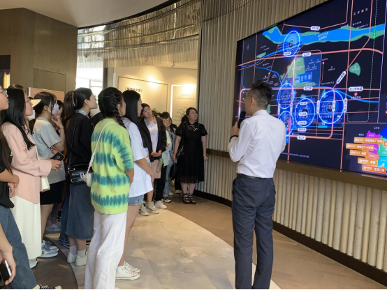 同学们跟随着讲解员的脚步,依次参观了项目沙盘、项目规划设计图、小区景观设计以及项目样板间,对于项目的策划、运营等方面进行了深入的学习与调研,深化了同学们的专业认知。